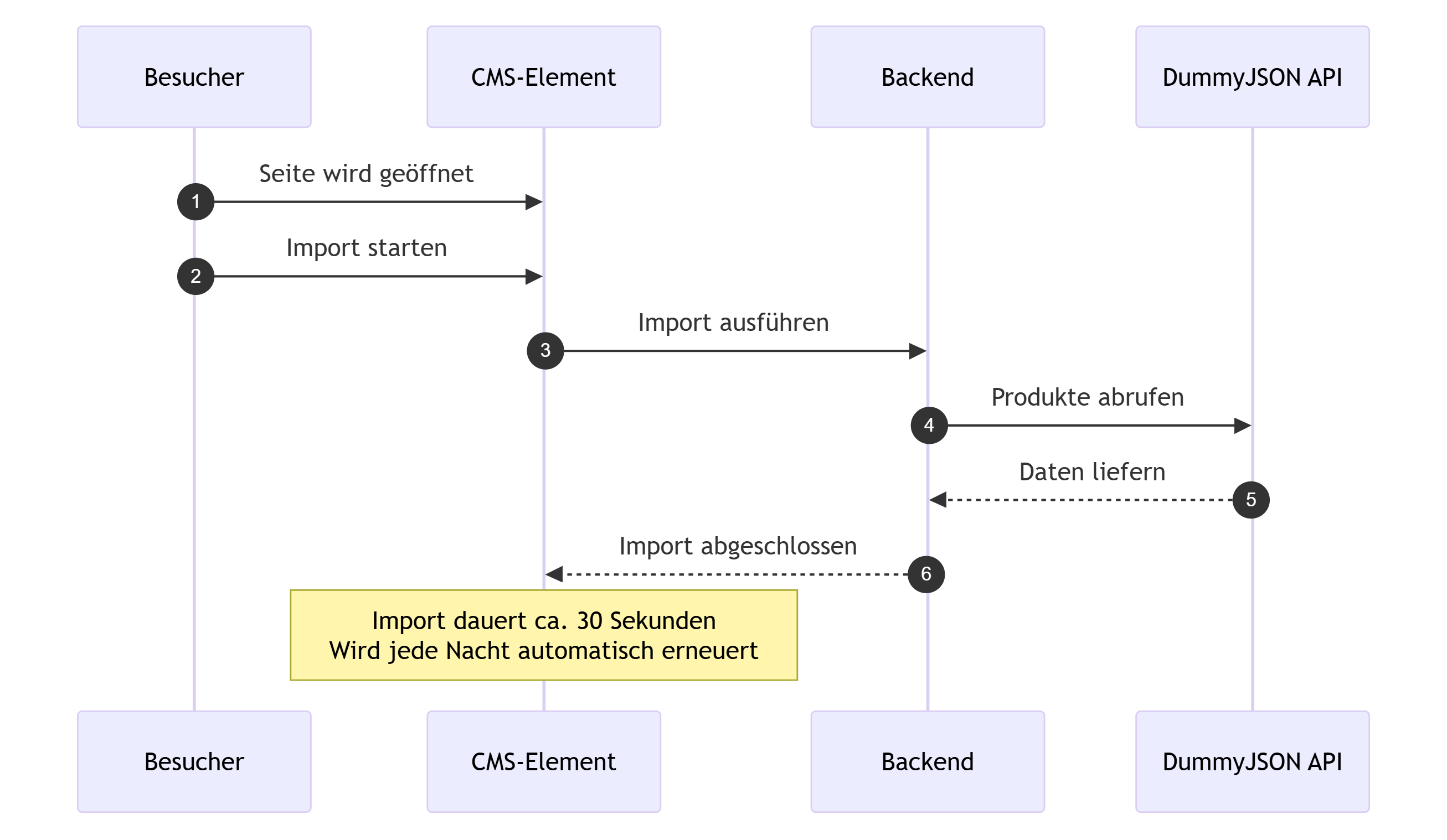 Produkte werden über die DummyJSON API importiert, um die Integration von REST-APIs, die Entwicklung von CMS-Elementen, Frontend- und Backend-Plugins sowie Performance-Optimierungen in Shopware 6 zu präsentieren.